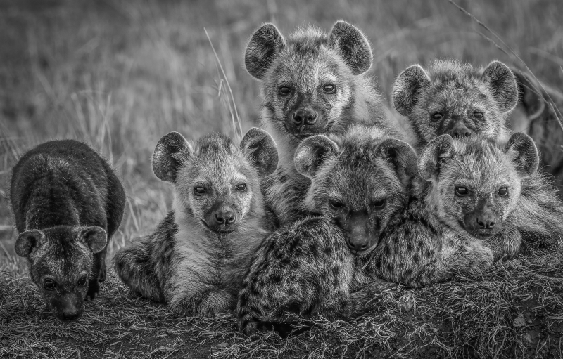 Monochrome Print: "Inquisitive Young at Hyena Den" by June Sparham DPAGB