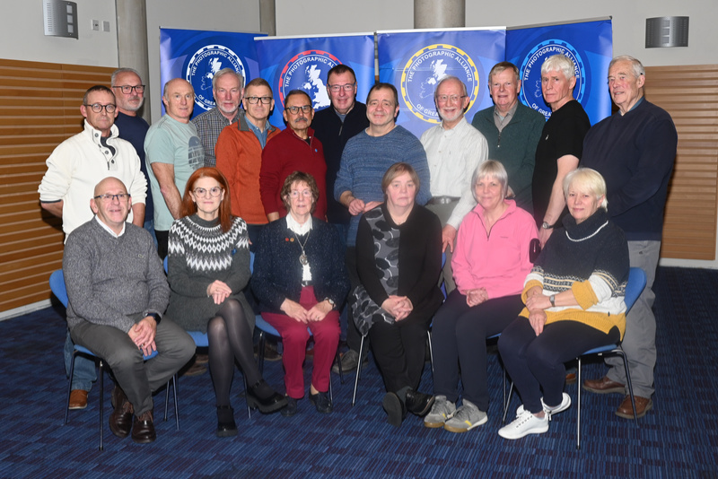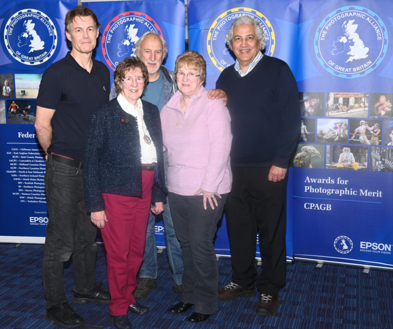 Alec MacAndrew CPAGB from St Neots & DCC (centre left, back row), Shaun Hykel CPAGB from Colchester PS (centre right, back row), David Pelling LRPS, CPAGB from Wymondham PS (back row, right). On centre left PAGB President and Secretary to the Awards Daphne Hanson DPAGB, HonPAGB.