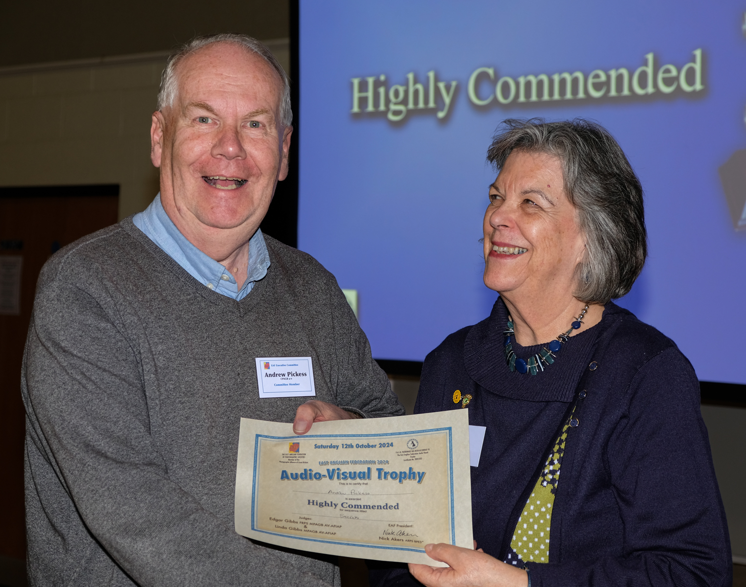 Dick Williams ARPS DPAGB-AV is the EAF AV Trophy Secretary who superbly organised (along with theSub-Committee) this year’s event together with a small army of volunteers, both technical, with all the presentation kit needed, and behind the scenes, including refreshments.