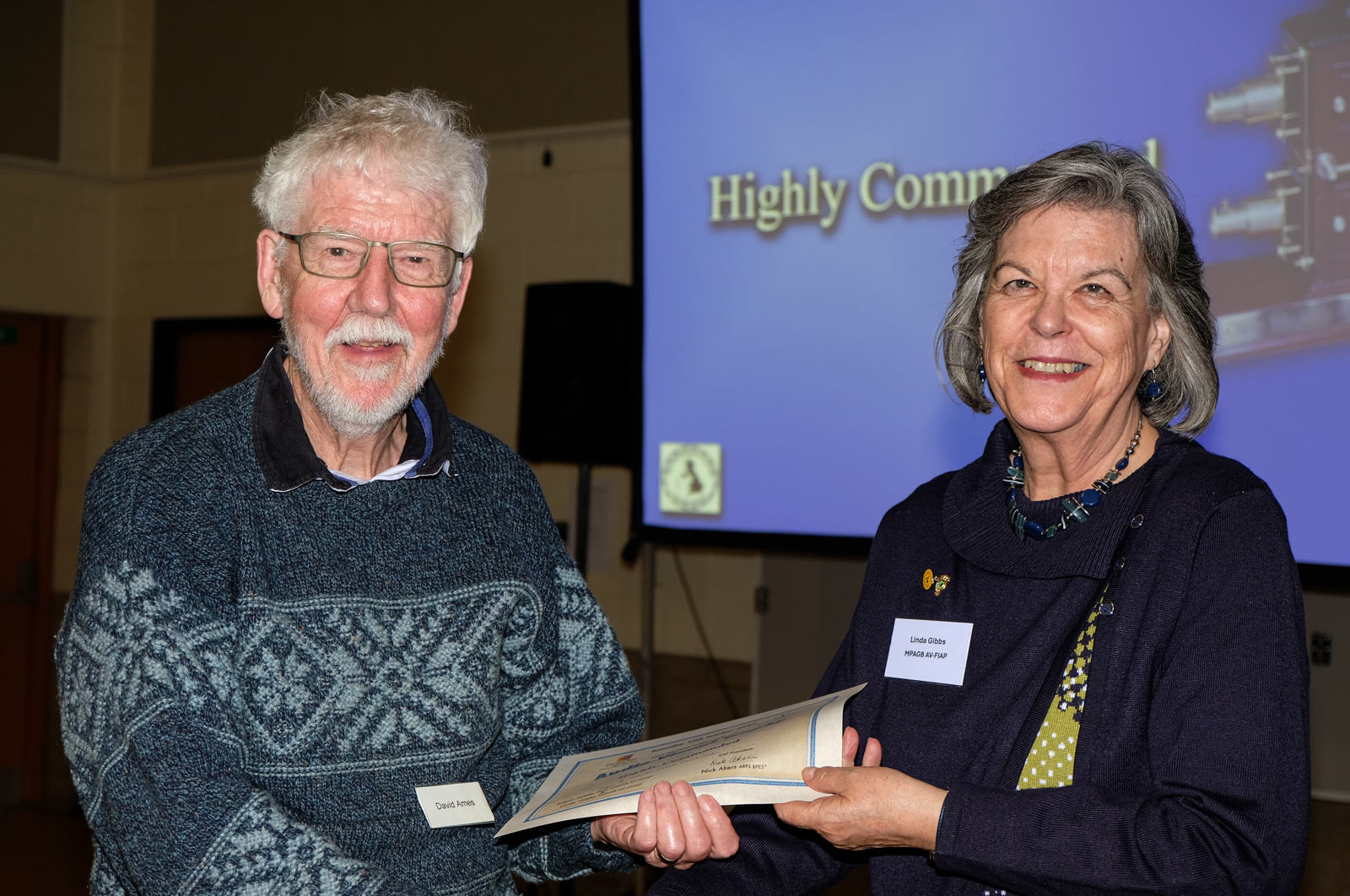 Images: Alison Jenkins receiving the Trophy for the Popular Vote from Nick Akers: Andrew Pickess receives his Highly Commended certificate from Linda Gibbs: David Ames receives his Highly Commended certificate from Linda Gibbs.