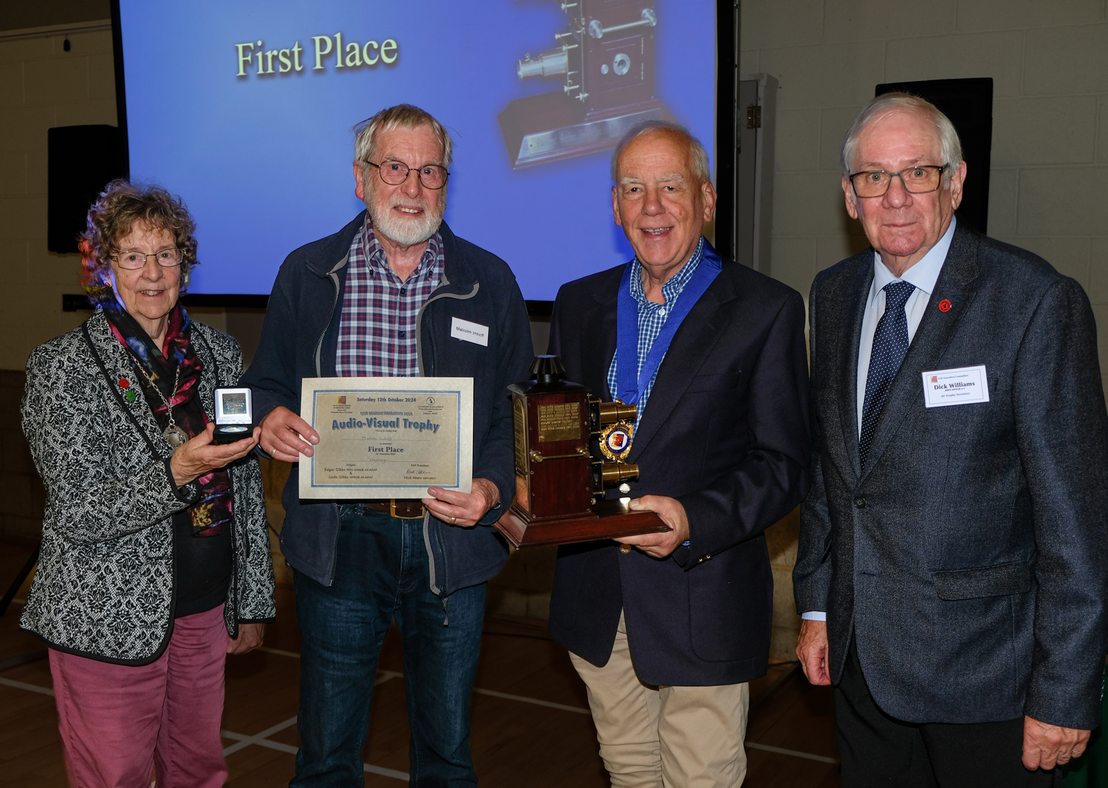 Image: Malcolm Imhoff (2nd from left) receiving the EAF Audio-Visual Trophy & Gold Medal from Nick Akers & Daphne Hanson