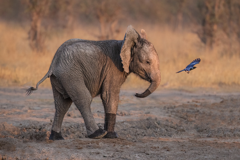 Colour Print: "Elephant Calf Chasing Birds" by Annie Nash
