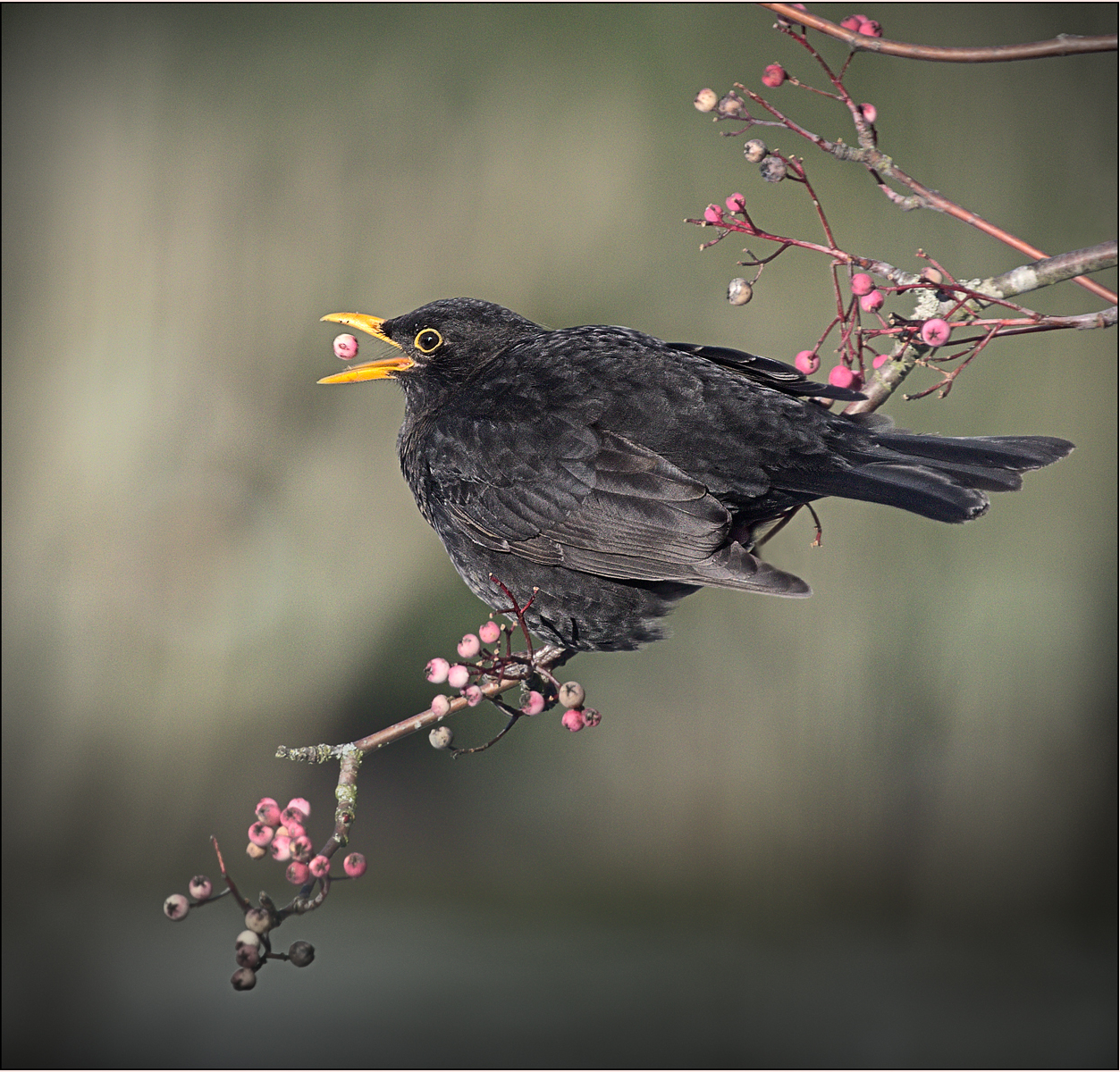 Personal selection of Sue Wilson ARPS DPAGB: “Blackbird Tossing Back a Pink Berry” by Alec Fraser of Chelmsford Camera Club