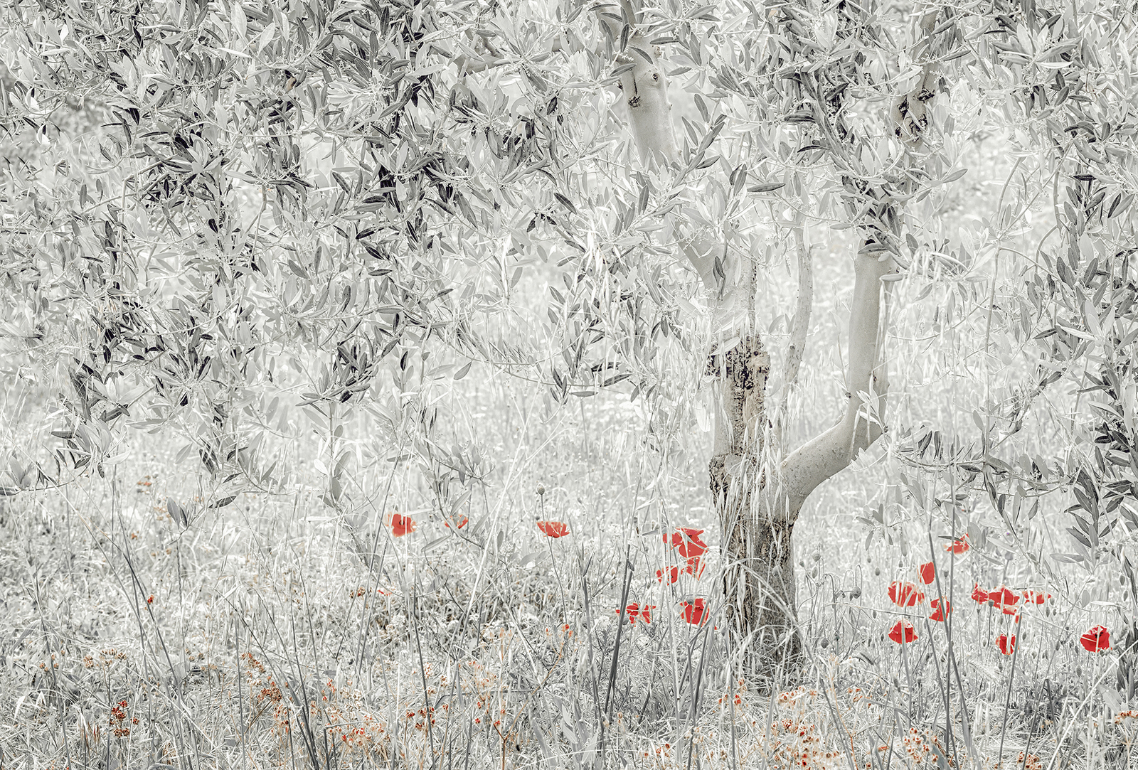 Personal selection of Ann Sutcliffe FRPS EFIAP APSA PPSA: “Olive Tree, Poppies and Mist” by Chris Thurston of Stevenage Photographic Society